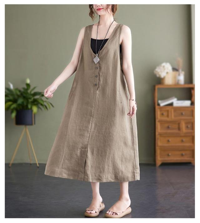 リネン サロペット スカート Vネック レディース ジャンパースカート ロング丈 綿麻混 ナチュラル 薄手 涼しい コットン オールインワン ゆったり 体型カバー ポケット付き きれいめ カジュアル 春 夏 秋 ブラック 黒 ベージュ 30代 40代 50代