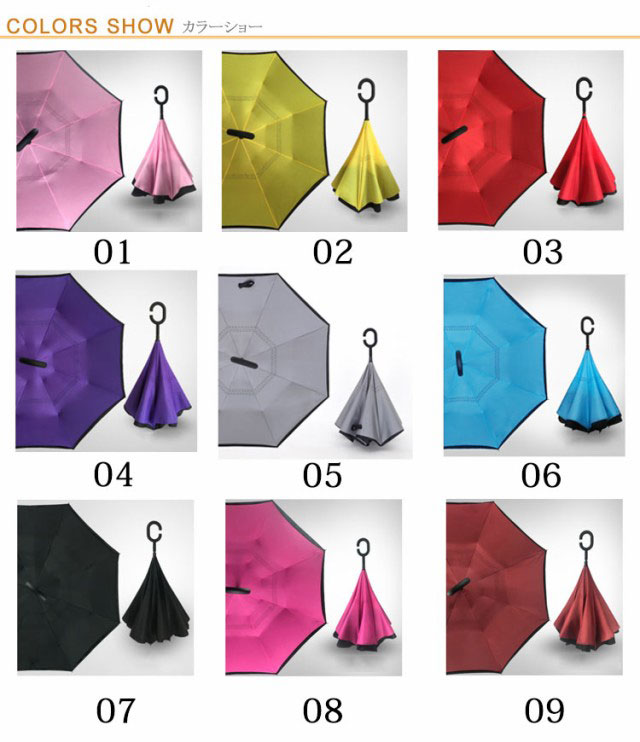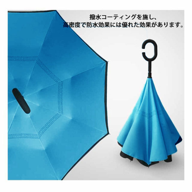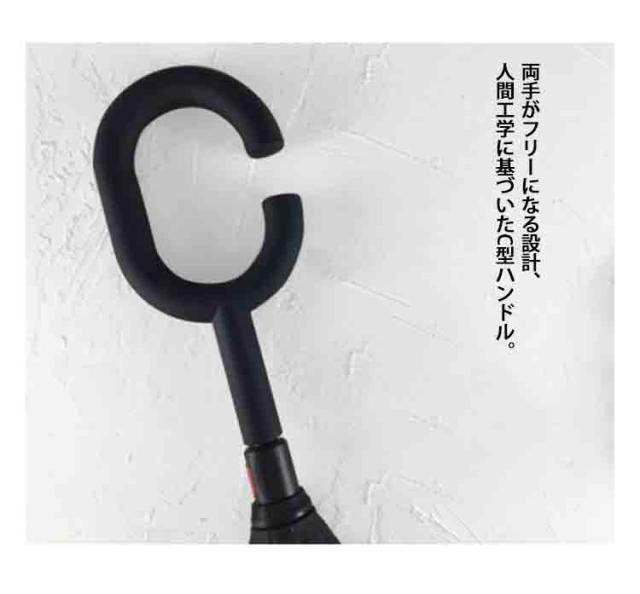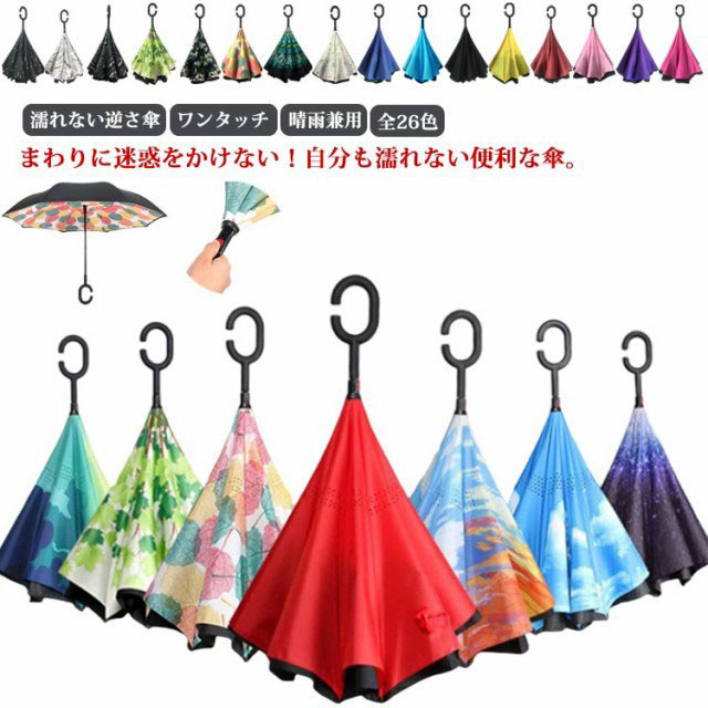 | 【濡れない逆さ傘】【ワンタッチ】【全26色】【晴雨兼用】 まわりに迷惑をかけない!自分も濡れない便利な傘。 傘が普通とは逆に開閉できることで、濡れるリスクを減らせます。 狭いところでも開閉できる、自立式逆さ傘。 両手がフリーになる設計、人間工学に基づいたC型ハンドル。 人間工学に基づいて設計された持ち手はとても持ちやすく、片手でワンタッチ自動で開きます。 雨の日もスマホの操作ができ、子供さんを抱っこしたりたくさん荷物を持つ事も可能。 撥水コーティングを施し、高密度で防水効果には優れた効果があります。 太陽からの直射日光や断熱効果も高い性能を誇ります。 高密度生地2枚をレイヤーすることによって驚くべき防水効果と紫外線防止効果を実現。 混んだ電車の中でも、洋服を濡らしません。 | |