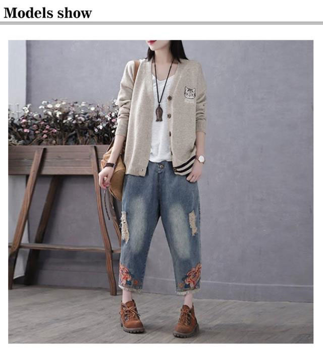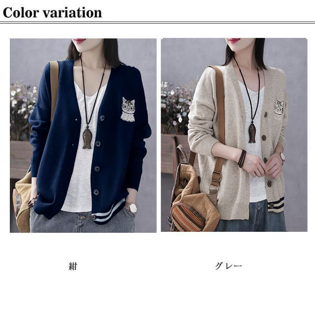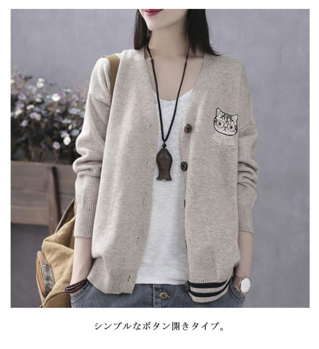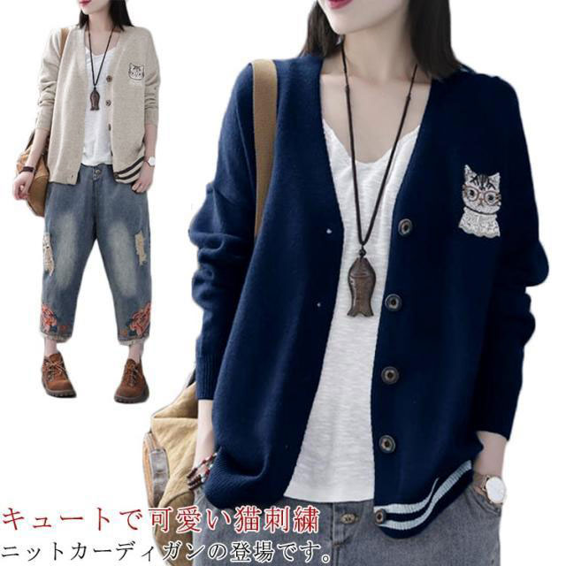 ニットカーディガン 猫柄 猫 刺繍カーディガン 送料無料 レディース 刺繍 カーディガン 長袖 羽織 ボタン付き ゆったり 森ガール 秋物 春物 セーター 前開き ナチュラル風 シンプル 森系