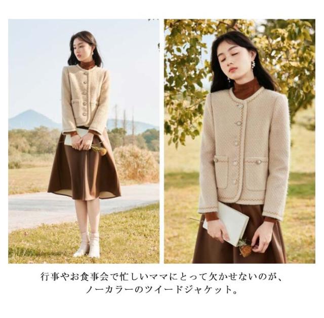 | カジュアルにもキレイめにも着回せる定番ノーカラージャケットがDebut。 すっきりノーカラー仕様で、華クラシカルなルックスに仕上がりました。 入学・入園・七五三などのママスタイルのコーディネートに大活躍。 しっかりとした素材で、穿くたびに生地独特のこなれた風合いに。 合わせやすい着丈で、スカートやパンツなどあらゆるボトムスと好相性です。 華やかなフォーマルシーンからセレモニースタイルまで幅広く着用できます。 行事やお食事会で忙しいママにとって欠かせないのが、ノーカラーのツイードジャケット。 | |