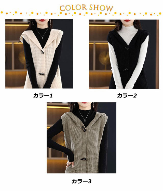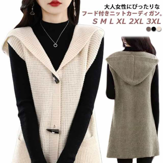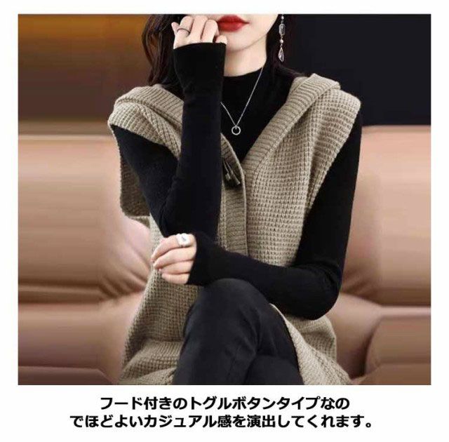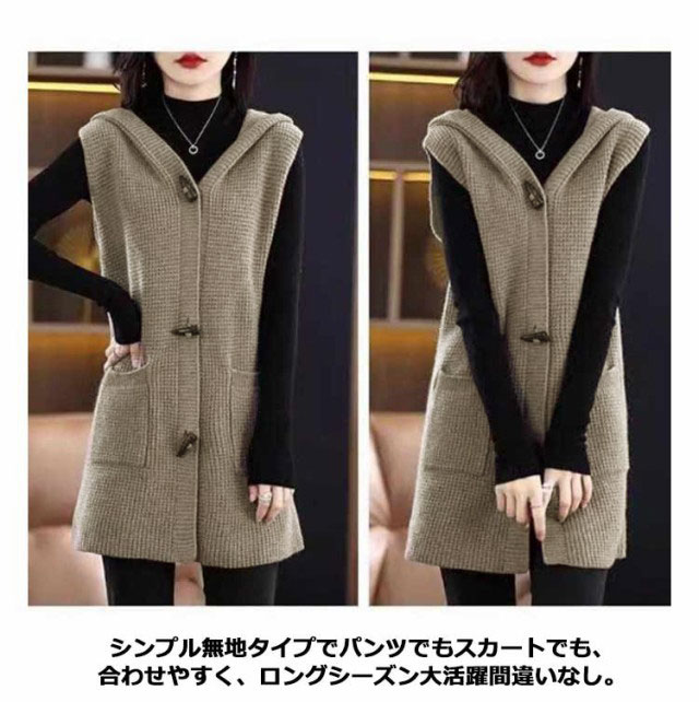 トグルボタン ニットベスト レディース ロング 前開き 秋冬 フード付き ノースリーブ ニットトップス ベスト チョッキ ロングベスト ニットジレ 羽織り 重ね着 レイヤード ゆったり 大きいサイズ S M L XL 2XL 3XL