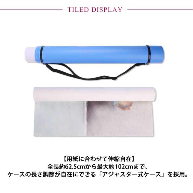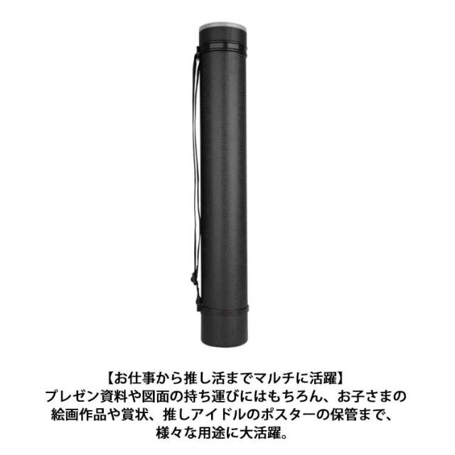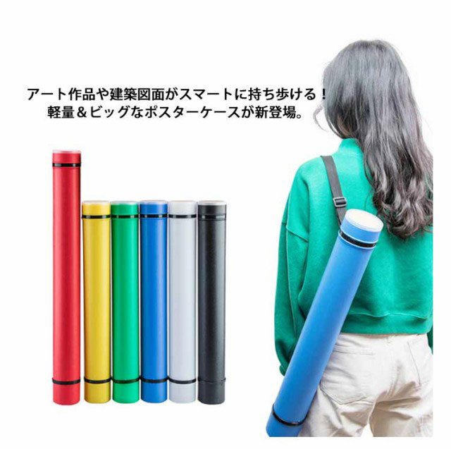 | 【ポスターケース】【伸縮・長さ調節】 アート作品や建築図面がスマートに持ち歩ける!軽量&ビッグなポスターケースが新登場。 【用紙に合わせて伸縮自在】 全長約62.5cmから最大約102cmまで、ケースの長さ調節が自在にできる「アジャスター式ケース」を採用。 【大判規格サイズにも対応】 A1サイズ、B1サイズ、A0サイズなど、大判サイズのポスターや図面、模造紙なども折り曲げずにラクラク収納可能。 【雨に濡れても慌てない!】 水滴やホコリ汚れに強いプラスチック素材のボディに、クルクルと回してきっちり閉まるキャップが付いた安心構造。雨の日でも作品や図面をしっかりとガード。 【らくらく肩掛けスタイル】 ショルダーストラップで肩掛けにすれば、両手がフリーになって公共交通機関での移動もスマート!。 【お仕事から推し活までマルチに活躍】 プレゼン資料や図面の持ち運びにはもちろん、お子さまの絵画作品や賞状、推しアイドルのポスターの保管まで、様々な用途に大活躍。 | |