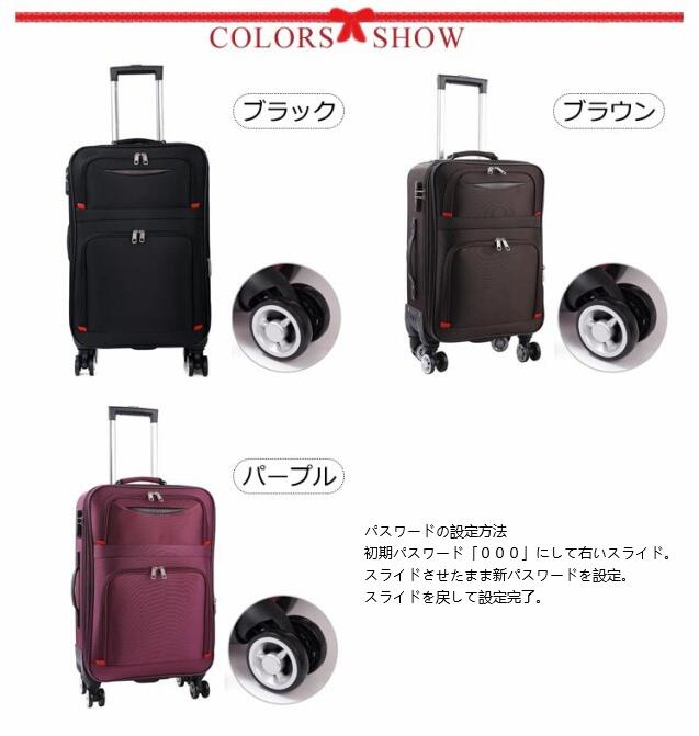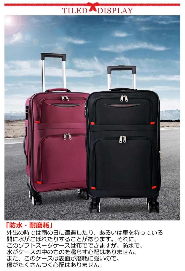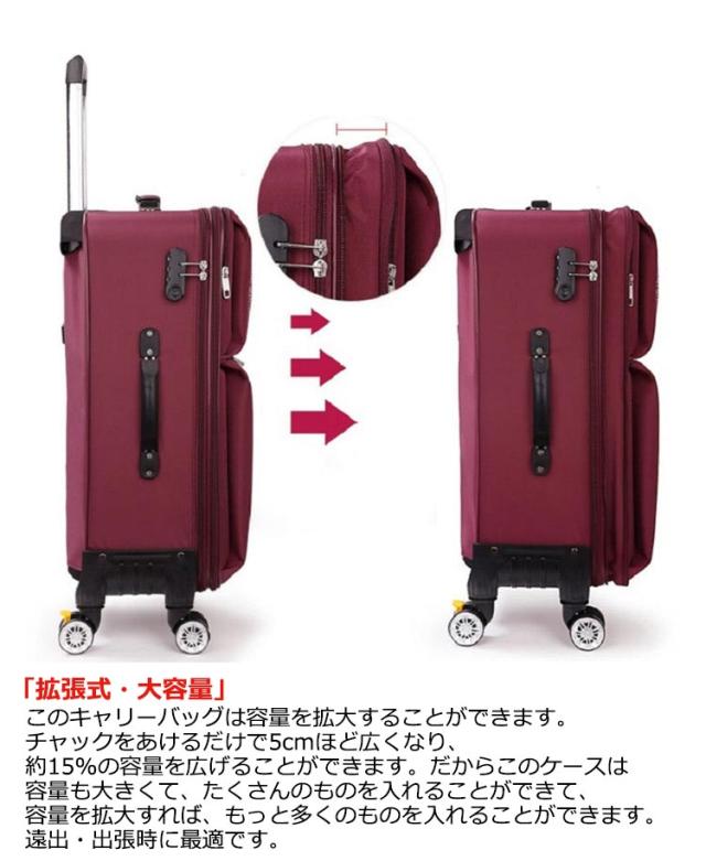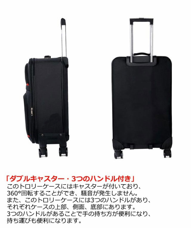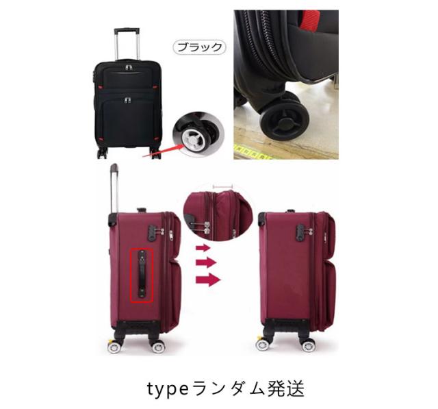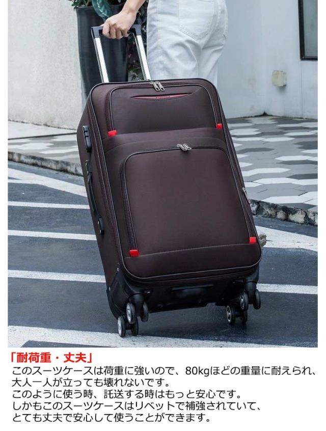 | 「拡張式・大容量」このキャリーバッグは容量を拡大することができます。チャックをあけるだけで5cmほど広くなり、約15%の容量を広げることができます。だからこのケースは容量も大きくて、たくさんのものを入れることができて、容量を拡大すれば、もっと多くのものを入れることができます。遠出・出張時に最適です。 「前あき・仕切り」このソフタイプトランクの前には荷物を入れるためのポケットが2つあります。このように、よく使うものをその2つのポケットに入れて取り出すのは便利で、トランクを開ける必要はありません。それに、トランクの内部には仕切りがたくさんあり、仕切りの中に異なるものを入れることができます。 「ダブルキャスター・3つのハンドル付き」このトロリーケースにはキャスターが付いており、360°回転することができ、騒音が発生しません。また、このトロリーケースには3つのハンドルがあり、それぞれケースの上部、側面、底部にあります。3つのハンドルがあることで手の持ち方が便利になり、持ち運びも便利になります。 「防水・耐磨耗」外出の時では雨の日に遭遇したり、あるいは車を待っている間に水がこぼれたりすることがあります。それに、このソフトスーツケースは布でできますが、防水で、水がケースの中のものを濡らす心配はありません。また、このケースは表面が磨耗に強いので、傷がたくさんつく心配はありません。 「耐荷重・丈夫」このスーツケースは荷重に強いので、80kgほどの重量に耐えられ、大人一人が立っても壊れないです。このように使う時、託送する時はもっと安心です。しかもこのスーツケースはリベットで補強されていて、とても丈夫で安心して使うことができます。 | |