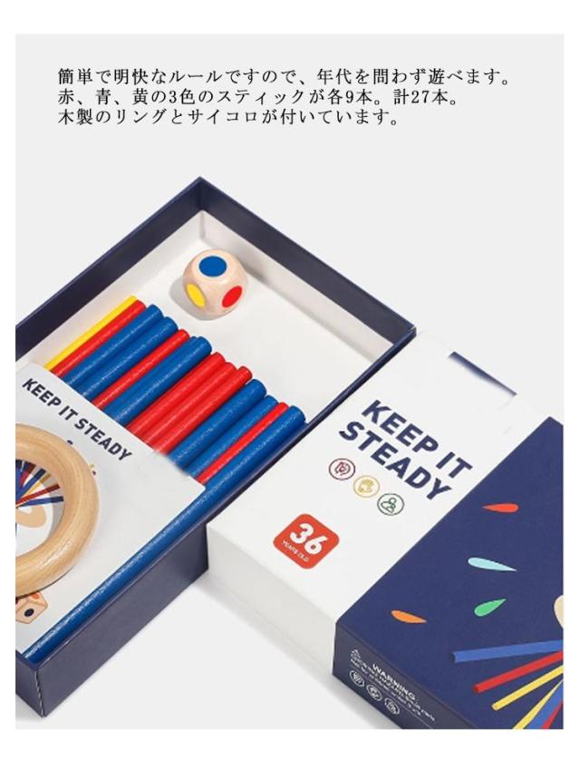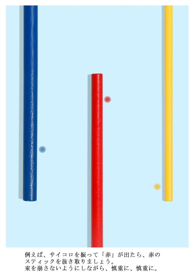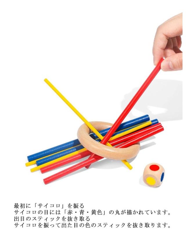 | とってもシンプルで、何度もやりたくなるスティッキー。 3色のカラフルな棒をリングの中に入れてサイコロの色に従って棒を抜き取っていくゲームです。 簡単で明快なルールですので、年代を問わず遊べます。 赤、青、黄の3色のスティックが各9本。計27本。木製のリングとサイコロが付いています。 また、棒がカラフルで可愛らしいのでギフトやプレゼントにも最適。 【ルール・遊び方】 ゲームの準備 まずは、スティックを束にしてリングに通します。 そして、束をねじって立たせます! 最初に「サイコロ」を振る サイコロの目には「赤・青・黄色」の丸が描かれています。 出目のスティックを抜き取る サイコロを振って出た目の色のスティックを抜き取ります。 例えば、サイコロを振って「赤」が出たら、赤のスティックを抜き取りましょう。 束を崩さないようにしながら、慎重に、慎重に。 無事スティックを取れれば、次の人の番です。同じようにサイコロを振って、スティックを抜いていきます。 リングが地面についたら終了 スティックが崩れて「リングが地面についたら終わり」です。 | |