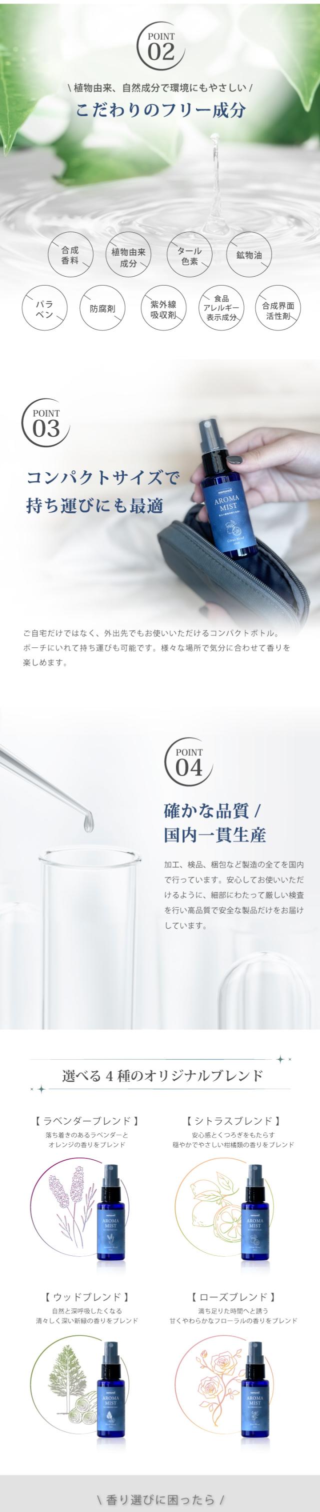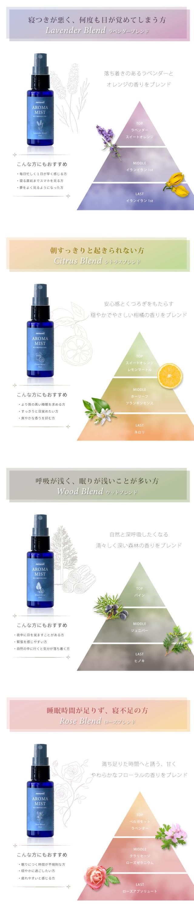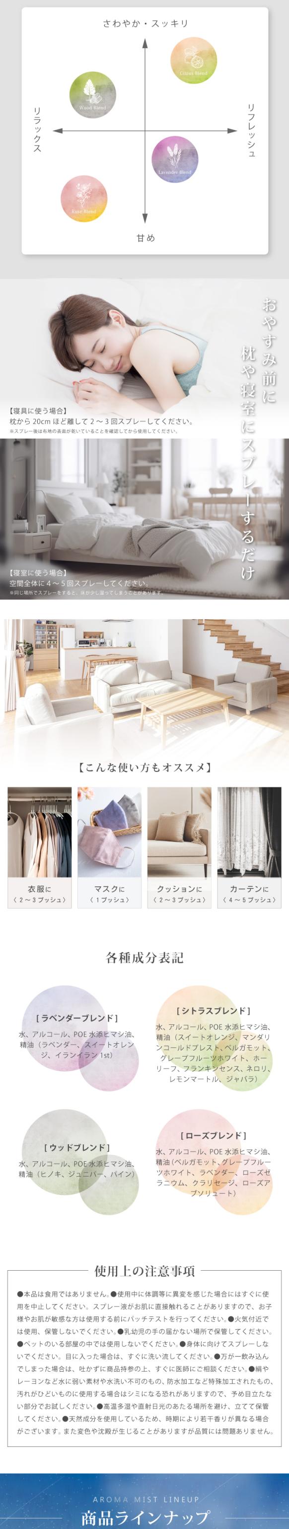 | 成分 | [ラベンダーブレンド] 水、アルコール、POE水添ヒマシ油、精油(ラベンダー、スイートオレンジ、イランイラン1st) [シトラスブレンド] 水、アルコール、POE 水添ヒマシ油、精油(スイートオレンジ、マンダリンコールドプレスト、ベルガモット、グレープフルーツホワイト、ホーリーフ、フランキンセンス、ネロリ、レモンマートル、ジャバラ) [ウッドブレンド] 水、アルコール、POE水添ヒマシ油、精油(ヒノキ、ジュニパー、パイン) [ローズブレンド] 水、アルコール、POE水添ヒマシ油、精油(ベルガモット、グレープフルーツホワイト、ラベンダー、ローズゼラニウム、クラリセージ、ローズアブソリュート) |