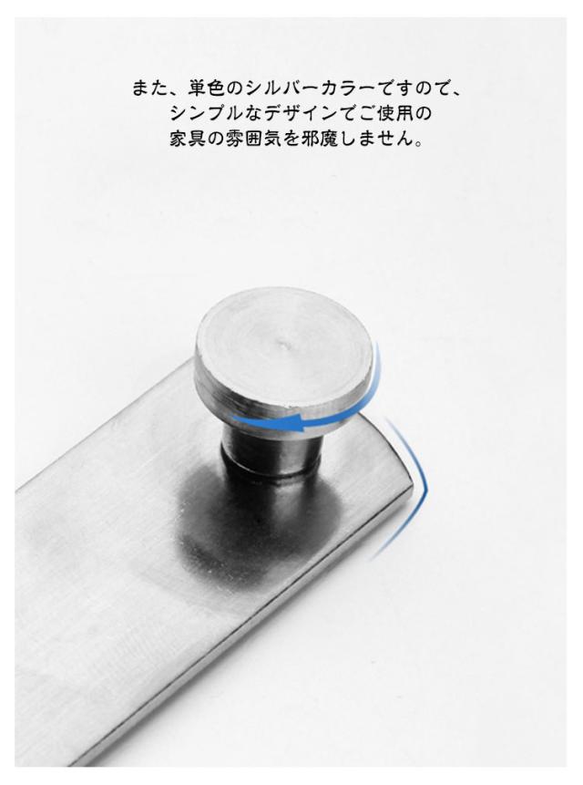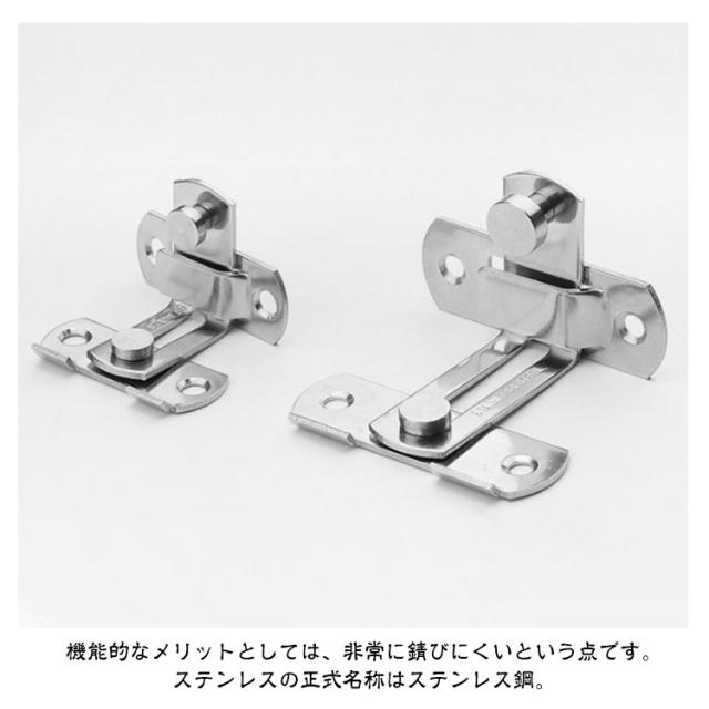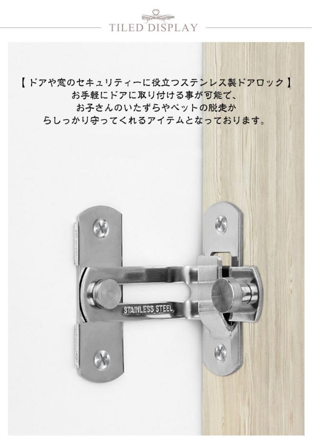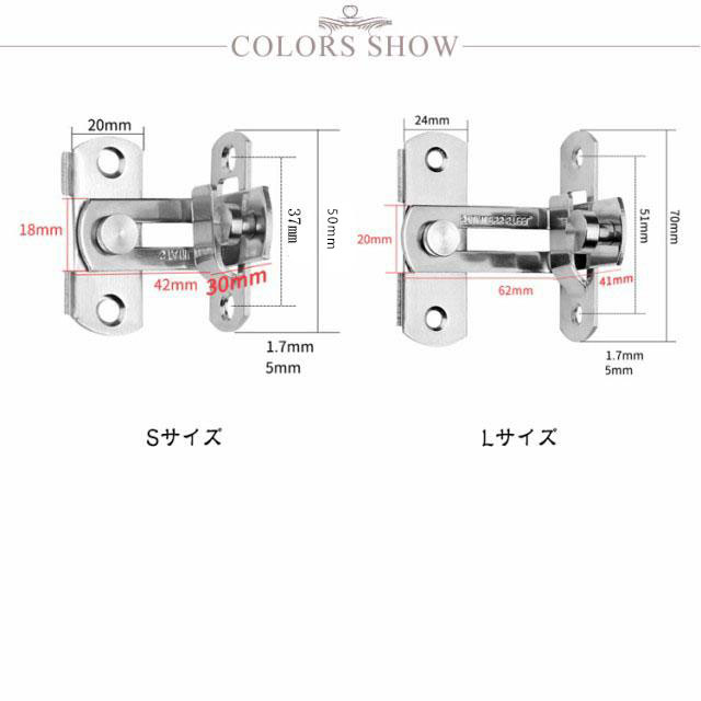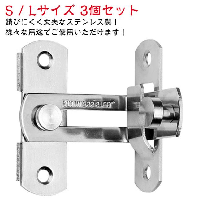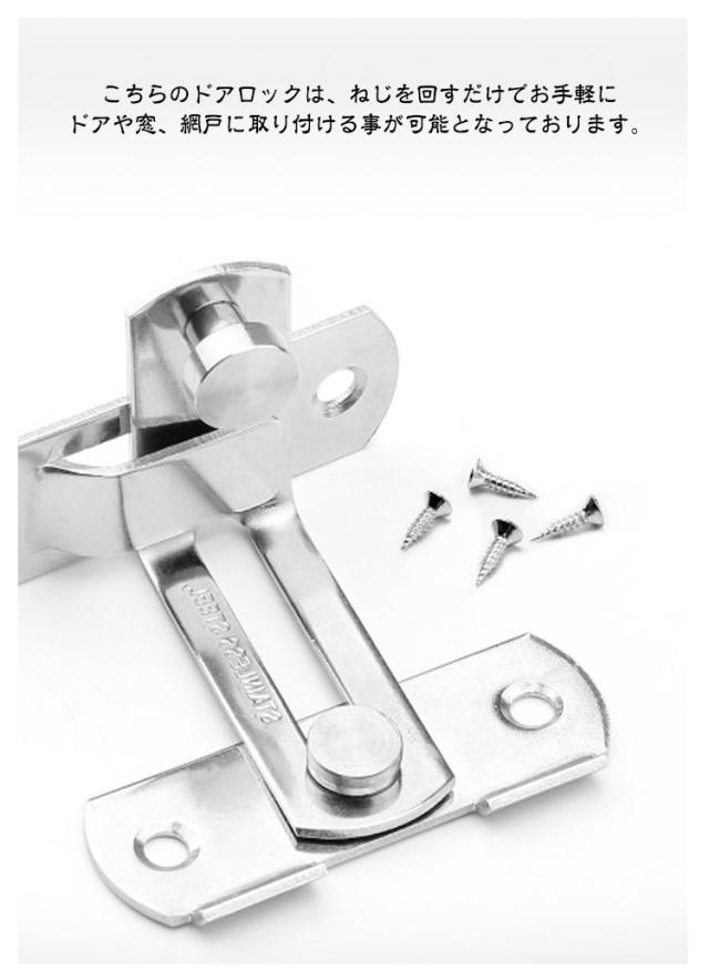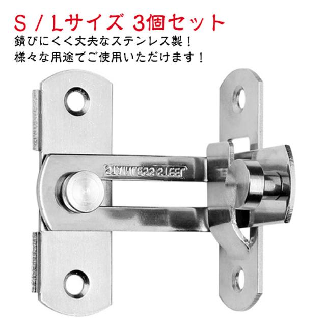 | S / Lサイズ 3個セット 【 ドアや窓のセキュリティーに役立つステンレス製ドアロック 】 お手軽にドアに取り付ける事が可能で、お子さんのいたずらやペットの脱走からしっかり守ってくれるアイテムとなっております。 【 様々な用途でご使用いただけます! 】 こちらのドアロックは、ねじを回すだけでお手軽にドアや窓、網戸に取り付ける事が可能となっております。 また、回すだけで施錠可能で、外部からの侵入からしっかり守ることが可能なアイテムとなっております。 そのほかにも、台所の棚や・キャビネット・オフィスの書類棚など、アイデア次第で様々なシーンでご使用いただけます。 事前に取り付ける箇所のご確認をお願いいたします。 【 錆びにくく丈夫なステンレス製! 】 こちらのドアロックは、ステンレスを採用しております。 ステンレス製のメリットとして、光があたると光沢を放ち、高級感がでます。 また、単色のシルバーカラーですので、シンプルなデザインでご使用の家具の雰囲気を邪魔しません。 機能的なメリットとしては、非常に錆びにくいという点です。 ステンレスの正式名称はステンレス鋼。 屋外の物置や小屋などにもご使用いただけます。 雨水に晒されても、錆びにくいため長くご使用いただけるドアロックです。 【 DIYのアイテムにも! 】 棚やキャビネットの鍵に使用するなど、アイデア次第でいろいろなものと組み合わせ可能です。 是非、本製品のドアロックを使用し、DIYをお楽しみ下さいませ。 | |
