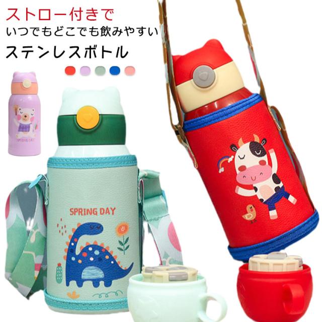 キッズ 水筒 500ml 子供 ストロー飲み ワンタッチ 水筒カバー付き ストラップ付き ステンレスボトル 斜め掛け 保冷 熱中症 ショルダー 男の子 女の子 幼児 保育園 幼稚園 小学校 入園 入学 魔法瓶