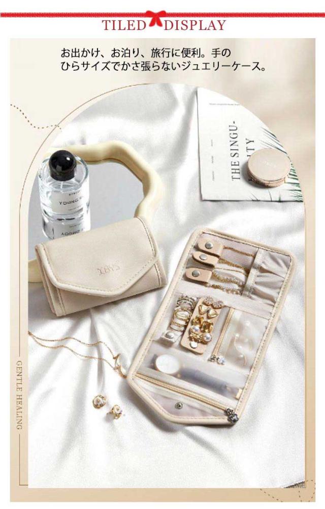 | コンパクトで収納力抜群のジュエリーポーチ お出かけ、お泊り、旅行に便利。手のひらサイズでかさ張らないジュエリーケース。 シンプルで可愛い、飽きが来ないデザイン。 仕事中などで、ジュエリーをはずす必要があるときでも、無くさず保管できるので、紛失の心配はありません。 軽くて丁度よいサイズで、鞄やスーツケースに入れでき、持ち運びやすい! 高級レザーを採用して、防水性が優れています。汚れにも清潔やすいです。 | |