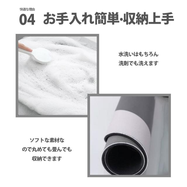 - 畳まれて真空パック状態で届いたので不安でしたが、ちゃんと吸収しました。今まで硬いタイプの珪藻土マットを使用していたので、柔らかいマットが新感覚です。