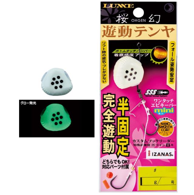 桜幻デルタシンカーと遊動式フックセットを組み合わせた遊動式鯛テンヤのコンプリートキット。付属のゴムチューブとビーズを使い分けて、半固定、完全遊動共に対応可能。フックには桜幻鯛テンヤ孫鈎として評価の高いフッキングマスターを使用。ラインは強度と適度なハリが絶妙なバランスの桜幻カスタムフックリーダー8号を使用し、活きエビだけでなく、冷凍エビにも対応。ワンタッチエビキーパーminiでエビを親バリにがっちりホールド。
