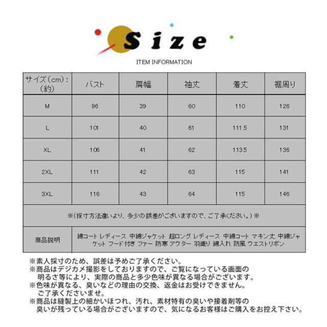 綿コート レディース 中綿ジャケット 超ロング レディース 中綿コート 中綿ジャケット フード付き ファー 防寒 アウター 羽織り 綿入れ 防風 ウエストリボン
