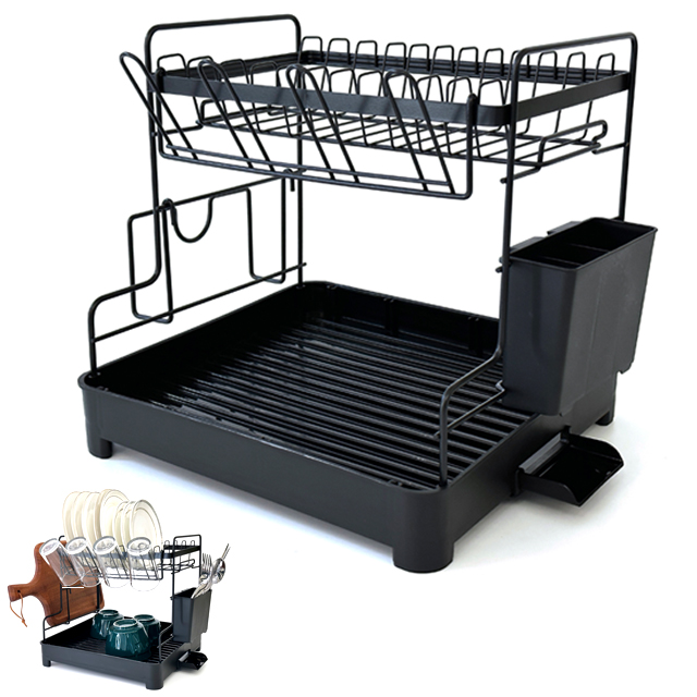 左右どちらでも省スペース設置!大容量コンパクト2段水切りラック (カラトリー 小皿 カップ 小鍋 スプーン ホーク 器)
