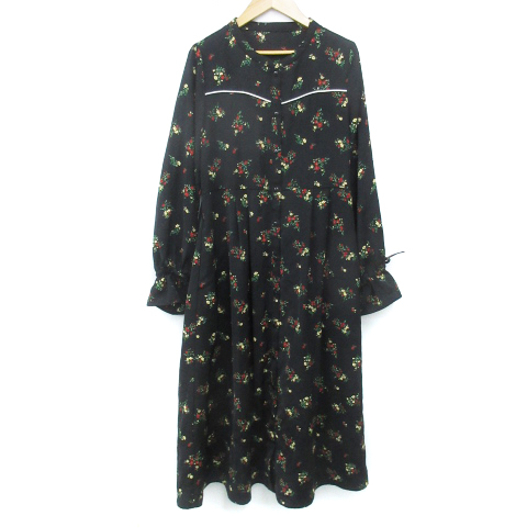 【中古】オリーブデオリーブ シャツワンピース フレアワンピース ロング丈 長袖 切替 花柄 F 黒 黄色 レディース