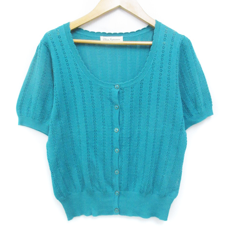 【中古】クリアインプレッション ニットカーディガン 薄手 ミドル丈 半袖 かぎ編み 2 エメラルドグリーン レディース