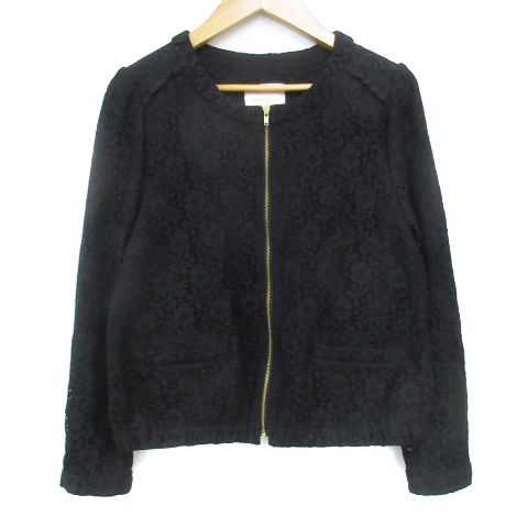 【中古】ミニマム ブルゾンジャケット ノーカラージャケット ミドル丈 総裏地 総レース ジップアップ 2 黒 レディース