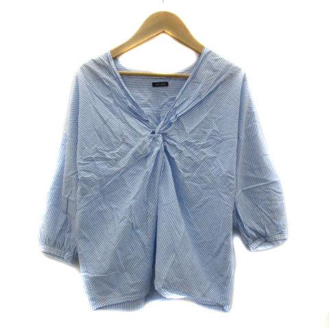 【中古】ユノートル ブラウス カットソー 七分袖 Vネック ストライプ柄 薄手 水色 ライトブルー 白 レディース