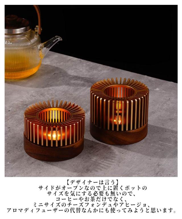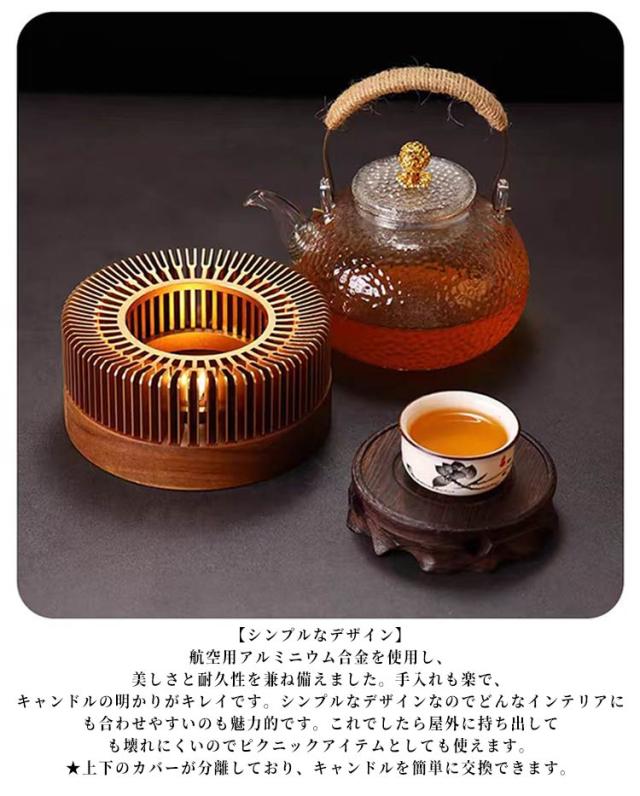 | ★【用途】キャンドルによる炎でティーポットを温め、お茶を長時間温かく飲むことが出来ます。小さな鍋や耐熱の容器があれば フォンデュやホットワインも 楽しめます。 ★上に陶器の皿を乗せて茶香炉にもなりますね。 ★ロウソクを付けて、ゆらゆら揺れる炎をボーッと眺めるルームランプの代わりや、停電などの緊急時にも使用可能かも。 ★【デザイナーは言う】サイドがオープンなので上に置くポットのサイズを気にする必要も無いので、コーヒーやお茶だけでなく、ミニサイズのチーズフォンデュやアヒージョ、アロマディフューザーの代替なんかにも使ってみようと思います。 ★【雰囲気アップ】揺らめく炎が茶を保温だけでなく、ろうそくが素敵に心をほぐす暖かい空間に大変身、いつものお茶会を素敵に演出します。キャンドルの炎が トロトロ感をキープして パーティを演出してくれます。★また、精油を揮発させて、いい香りが部屋を漂っていますね。あたたかい雰囲気を作り出します。 ★【シンプルなデザイン】航空用アルミニウム合金を使用し、美しさと耐久性を兼ね備えました。手入れも楽で、キャンドルの明かりがキレイです。シンプルなデザインなのでどんなインテリアにも合わせやすいのも魅力的です。これでしたら屋外に持ち出しても壊れにくいのでピクニックアイテムとしても使えます。★上下のカバーが分離しており、キャンドルを簡単に交換できます。 | |