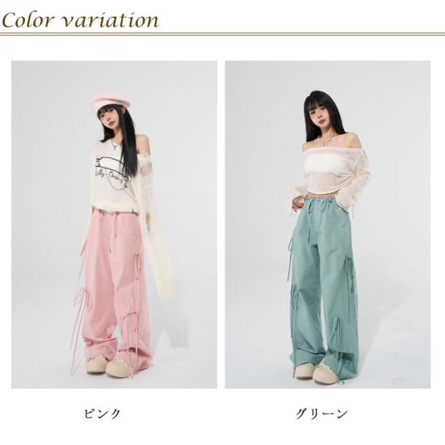 | 薄手で軽やかな穿き心地のミリタリーナイロンカーゴパンツ。 サイドにリボンをあしらって、愛らしい印象に! 余裕のあるサイズ感で可愛らしいポイントが魅力。 ウェストに通した紐の絞り具合でお好みのシルエットに調整可能です。 着回しやすく、大人のカジュアルスタイルにピッタリなアイテムです。 | |