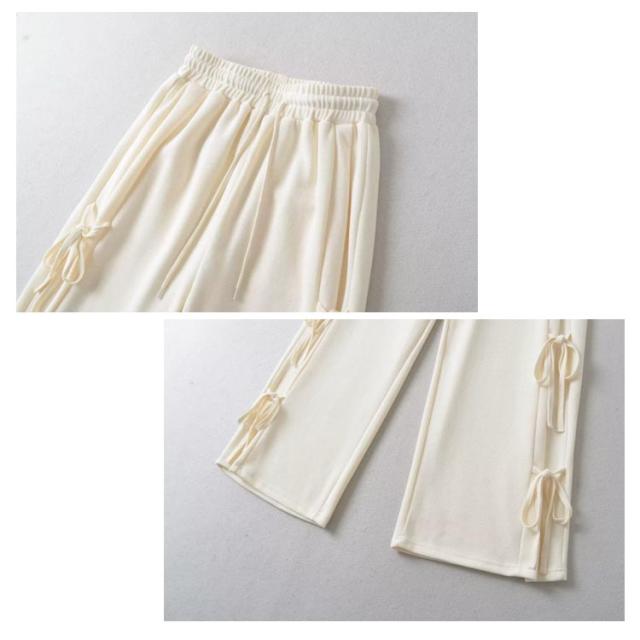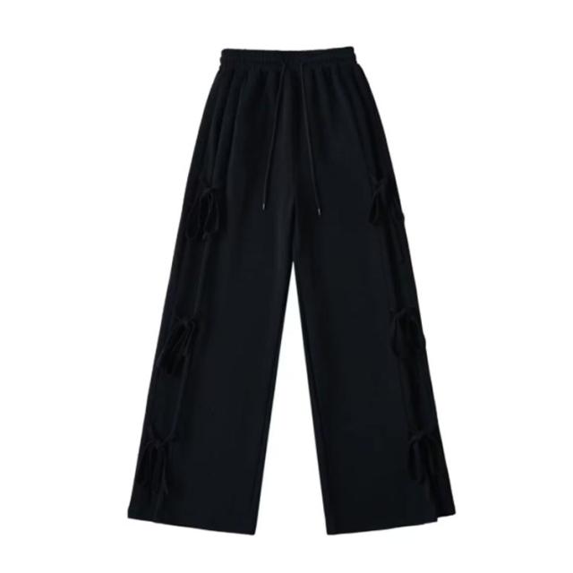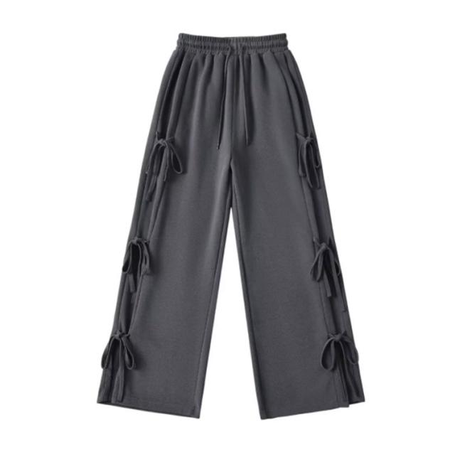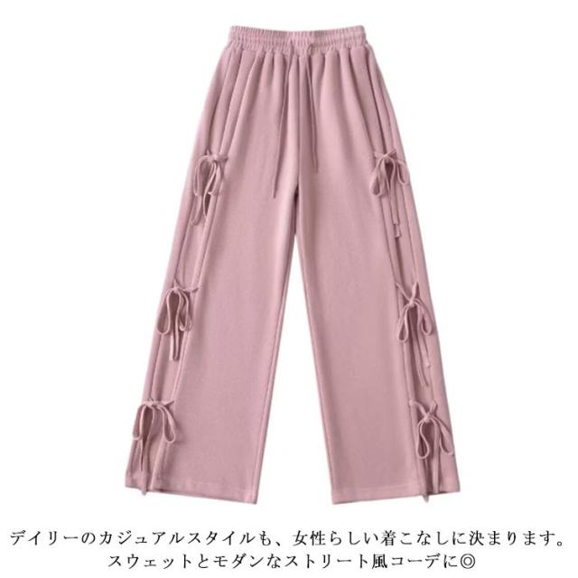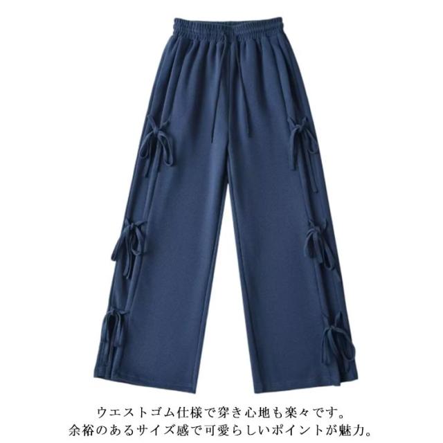 パンツ サイドリボン ロング丈 ボトムス ゆったり ワイドパンツ スウェットパンツ ワイド ウエストゴム リボン ルーズ リボンポイント カジュアル サイドリボン 楽ちん 送料無料 部屋着 ルームウェア レディース 春 秋
