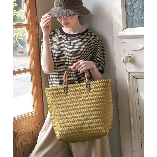 夏を感じさせる編み込み素材&バンブー風持ち手を使用トートバッグ。