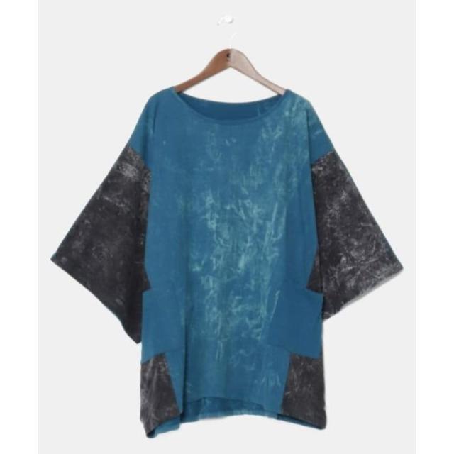 アシッドウォッシュ加工が目を引く変形トップス。バイカラーと大き目のポケットがシンプルながらも個性が光る。肌触りなめらかな綿ジャージ素材が魅力的な一枚。