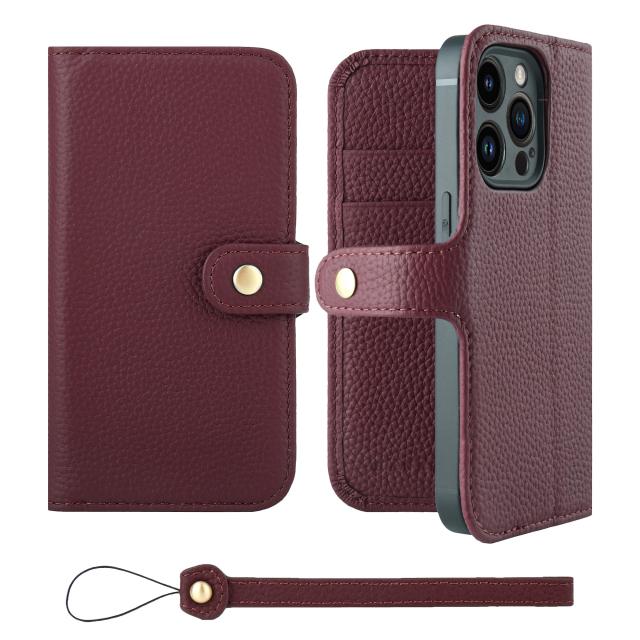 [HANATORA] iPhone14Pro ケース 手帳型 本革 シュリンクカーフレザー スマホケース スタンド機能 ベルトあり マグネットなし ワインレッド H0XB-14Pro-Wine