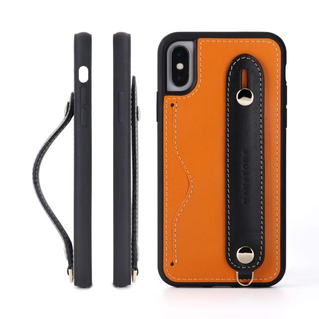 iPhone Xs/X グリップケース レザー 本革 ストラップ付属 イタリア製牛革 ヌメ革 片手操作 カード収納 スタンド機能 メンズ レディース オレンジ/ブラック