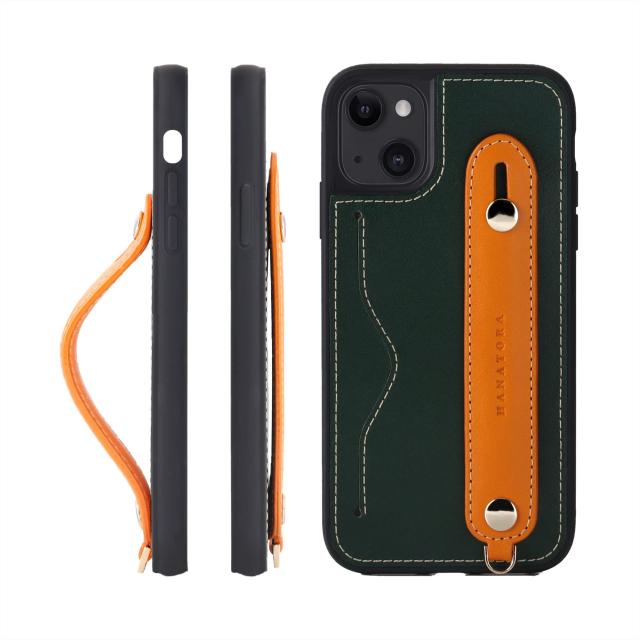 [HANATORA] iPhone 15 ケース 本革 グリップケース レザー ストラップ付属 イタリア製牛革 ヌメ革 片手操作 カード収納 スタンド機能 メンズ レディース グリーン/オレンジ CGH-15-Green-OG