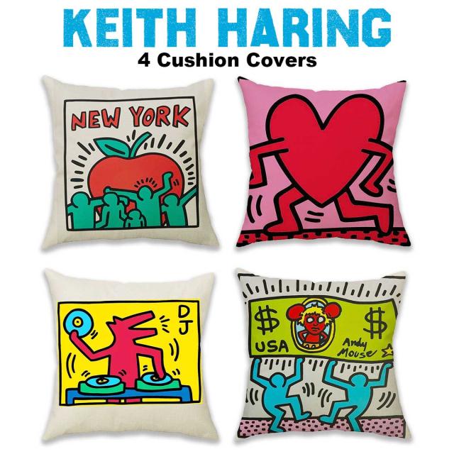 4枚セット キースヘリング クッションカバー 45×45cm KEITH HARING リネン 麻 クッション ポップアート インテリア 雑貨