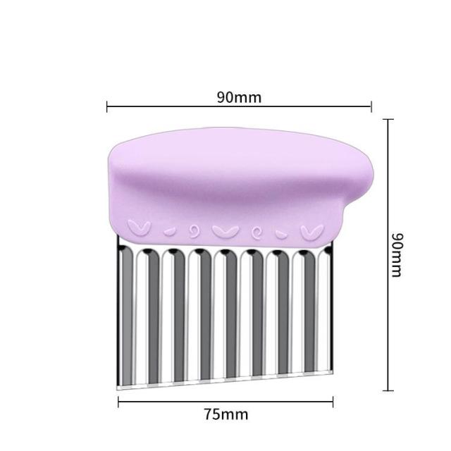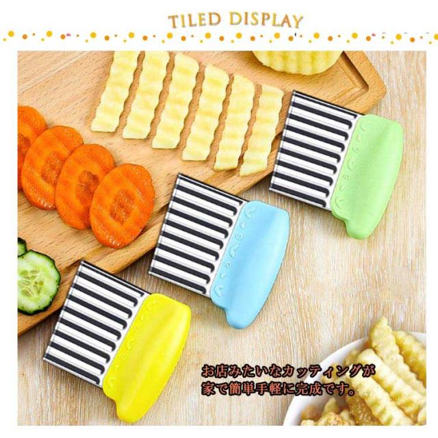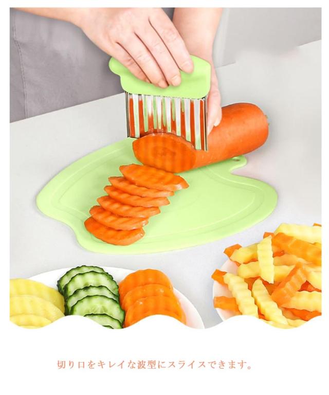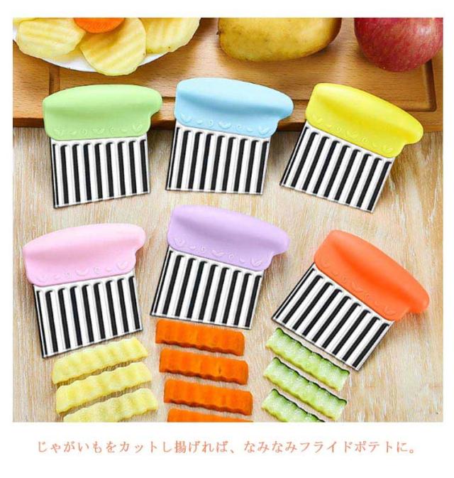 | 野菜や果物の飾り切りに! 切り口をキレイな波型にスライスできます。 お店みたいなカッティングが家で簡単手軽に完成です。 じゃがいもをカットし揚げれば、なみなみフライドポテトに。 チーズや豆腐、ジャガイモなどを波型に切るとつかみやすくオススメです。 | |