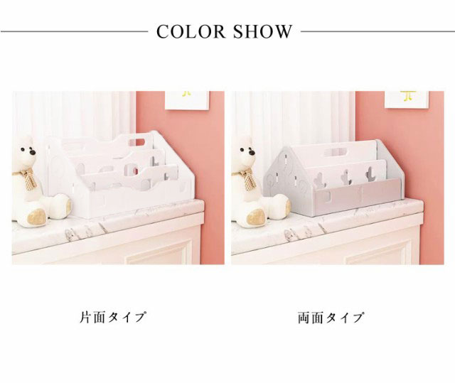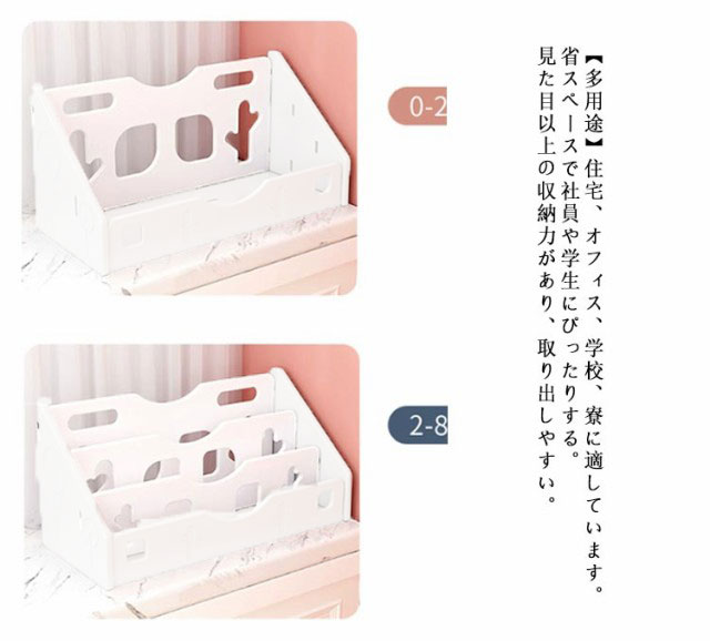 | 【優しい素材】丈夫なプラスチック材質を採用し、錆びなく、安定性も良く、勝手に倒れる心配もなし。 【多機能文具収納ボックス】複数のスペースに分けられたラックです。書類の分類整理保存にとっても便利です。書類トレーはポストカード、手紙、レター、郵便物、付箋、ハガキ、パンフレット、書類ファイルなどオフィス用品も収納できます。 【使いやすい】コンパクトなサイズで好きな場所へ設置可能。 組立ても簡単で工具を使わずに使用勝て良い便利なアイテムです。 【便利】絵本だけでなくおもちゃもまとめて収納できます。 【多用途】住宅、オフィス、学校、寮に適しています。省スペースで社員や学生にぴったりする。見た目以上の収納力があり、取り出しやすい。 【贈り物に最適】デスクをすっきりとおしゃれに保つことができます。また、家族、同僚、友達、先生などへのプレゼントにも最適です。 片面タイプ:1.写真のように板を置けて、 一つの横側の板を立てる。 2.前後と中間の仕切り板を設置する。 3.もう一つの横側の板と仕切り板押してしっかりセットする。 両面タイプ:1.写真のように底、前後や横の板を置けて、一つの横側の板を立てる。 2.前後と中間の仕切り板を設置する。 3.もう一つの横側の板と仕切り板押してしっかりセットする。 | |