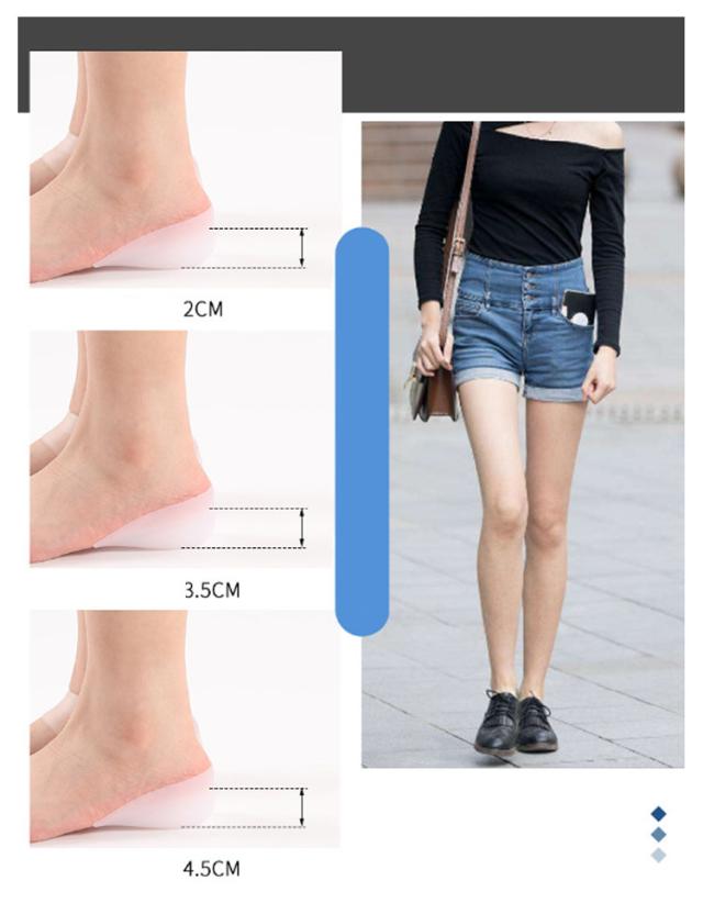 | 2.0cm〜5.5cm身長UP!シークレットインソール。 柔軟性と弾力性があるシリコン素材で、抗菌・防臭力に優れており靴を脱いでも身長そのまま長時間の装着でも快適です。 靴下で隠せるインナータイプのシークレットインソール、かかとの痛み、足底筋膜炎、チクチクする骨やかかとを緩和します。 ブーツやスニーカーなど様々な靴に使用可能なインソールで、身長を自然に伸ばして今までとは違う自分に! インソールの表面と底面には特別な設計が使用されて、足の滑りをとめることができます。歩く時にはもっと安定します。 | |