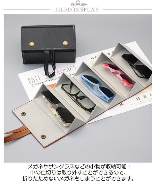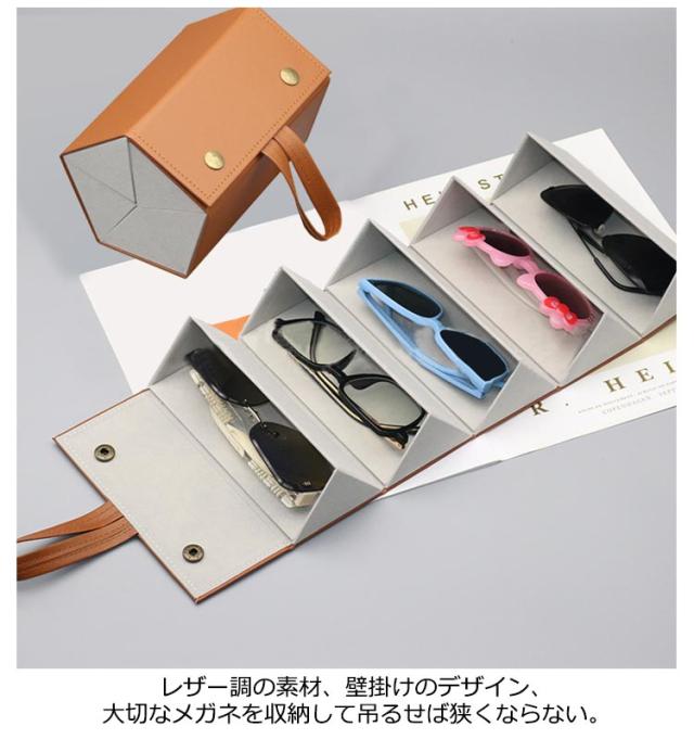 | 5本収納 折りたたみメガネ収納ケース メガネやサングラスなどの小物が収納可能! 中の仕切りは取り外すことができるので、折りたためないメガネもしまうことができます。 レザー調の素材、壁掛けのデザイン、大切なメガネを収納して吊るせば狭くならない。 どんなお部屋にも合わせやすいデザインです。 ハンドストラップが付属していますので、閉め時そのまま持ち運び可能です。 家族旅行や出張に小物の収納にも大変便利です。 | |