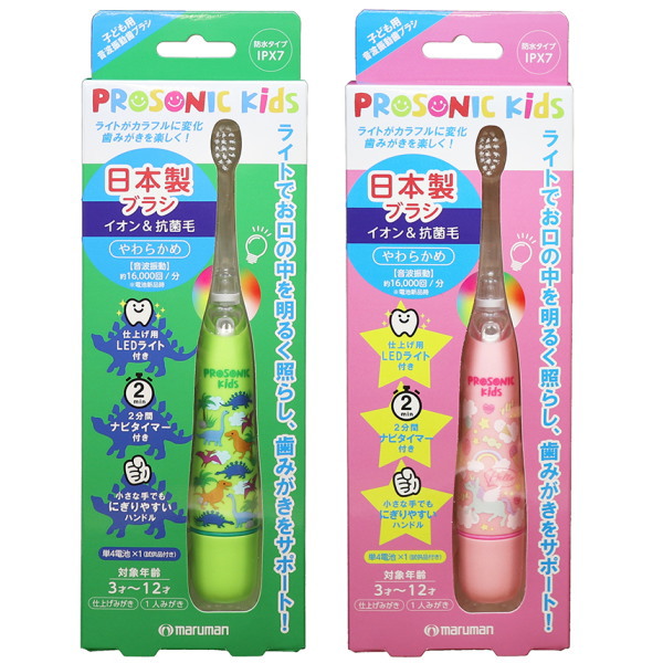 子供用 日本製 音波振動歯ブラシ マルマン プロソニックキッズ グリーン ピンク 2本セット 16,000ブラシストローク/分 DH001-2 ネコポス便対応品