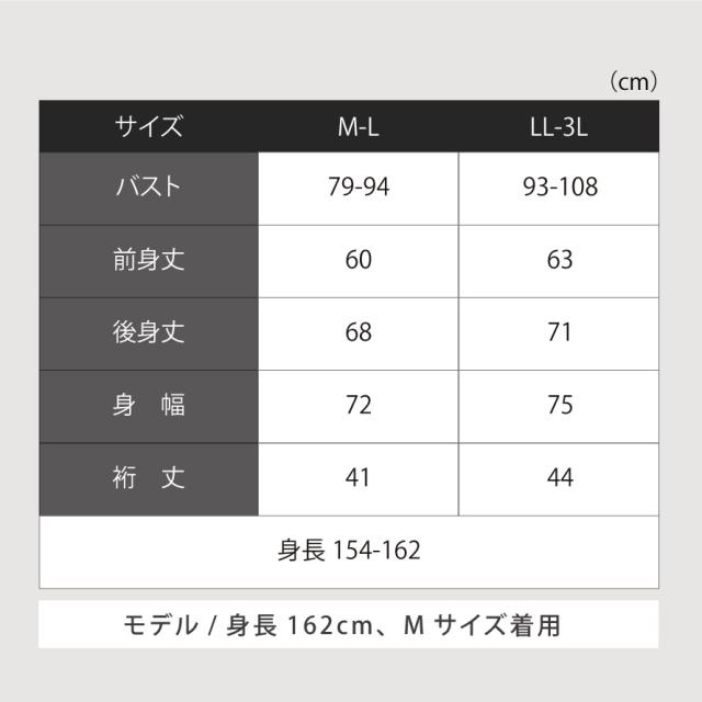 ■サイズ:身長154-162、M-L/バスト79-94、前身丈60、後身丈68、身幅72、裄丈41、LL-3L/バスト93-108、前身丈63、後身丈71、身幅75、裄丈44cm。モデル/身長162cm、Mサイズ着用。