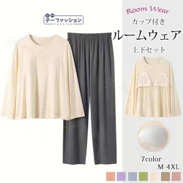 ルームウェア 上下セット カップ付き 春新作 送料無料 レディース長袖 パジャマセット 部屋着 寝巻き ラウンドネック 女性 大人 薄手 おしゃれ ゆったり インナー 下着 パンツ トップス おうち時間 寝間着 ナイトウェア 入院 産後リラックス 秋服 秋冬 バレンタイン