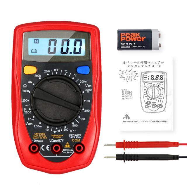 X-XIANQI DT33Dマルチメーターは、電気技術者、愛好家、専門家、一般家庭でのご利用できる便利なアイテムです。 簡単の操作で様々な電気問題を簡単かつ正確に解決するように設計されております;電流、電圧、抵抗値、導通チック、ダイオード測定などに対応;なお、自動車および家庭におけるコンセント、ヒューズ、配線、汎用バッテリー、車両バッテリー、充電システム、自動車用回路などにも適用します; テスター デジタル テスター マルチメーター2000カウント マルチメーターは、自動車および家庭用のさまざまな電気問題を正確にトラブルシューティングするように設計されています。 操作が簡単であり、電流、電圧、抵抗を測定するためのさまざまな機能に加え、自動車、家庭用の導通、ダイオードテストを備えています。 DC電流、AC/DC電圧、抵抗値、導通チック、ダイオード測定 バックライト大画面LCDとデータホールド オーバーレンジ保護機能 低電量提示 スタンドと保護ゴムスタンドと保護ゴム 裏面に内蔵したスタンド120°まで固定可能、両手が作業に集中し、効率アップ;分厚い保護ゴムによって、耐衝撃性も高いです; 低電量提示 内蔵バッテリーの残量が少なくなると、低電量提示がディスプレイに表示されます;バッテリーの不足による測定ミスが回避できます; データホールド データホールドを使用してデータを簡単に読み取り、記録するのが便利です。 バックライト付きLCD 薄暗い環境での視認性のために白いバックライトLCDを備えた大型デジタルディスプレイ。 電気問題のトラブルシューティング X-XIANQI マルチメーターは、電気問題のトラブルシューティングを行うために、または電子機器の測定のために専門的に設計されています。 導通チック テストリードを測定対象となる回路上の2点に接続し、チックをします。 DC電圧:200mV±(0.5%+ 3),2000mV/20V/200V±(0.8%+ 2) ,500V±(0.8%+ 3) AC電圧:200V / 500V±(2%+ 10) DC電流:2000μA/ 20mA/ 200mA±(2%+ 5)、10A±(2.5%+ 5) 抵抗:200Ω±(1.5%+ 5,2000Ω/20KΩ/200KΩ±(1%+ 4)、20MΩ±(1%+10)、200MΩ±[1%+10]インテリジェントアンチフュージョン二重ヒューズ 2重ヒューズ保護により、より安全で信頼性が高い、このマルチメーターのデザインは安全性を考慮している。すべての範囲の過負荷保護。 パッケージ内容 1 x X-XIANQI デジタルマルチメーター 1 x 9V 6F22バッテリー 2 x テストリード 1 x 日本語ユーザーマニュアル 表示総数: 2000カウント、3 1/2桁 レンジ選択: マニュアル レンジ サンプルレート :1秒あたりに2回 過負荷表示: 数字”1”のみ画面に表示 電源: 9V 6F22バッテリー 寸法:13cm x 7.3cm x 3.7cm