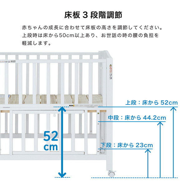 | 商品説明 | ●対象:生後24ヶ月頃まで ●PSC・SG合格品 ●コンパクトに折りたためる ●床板高さ3段階調節 ●お世話に便利な開閉扉 ●ベッド下スペースの収納に便利な開閉式収納扉 ●通気性の良いスノコ床板 ●組立式 |