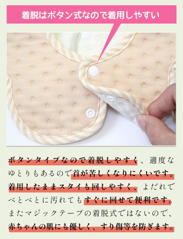 ボタン式なのでマジックテープとは違い赤ちゃんの肌へすり傷を防ぎスタイもとれにくく快適です。