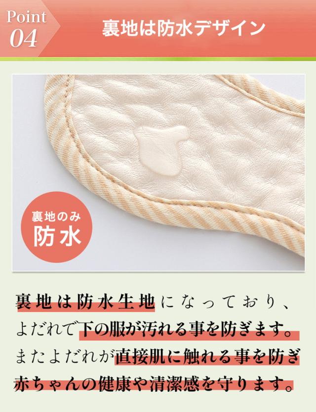 裏面は防水生地になっており、よだれが下の服に染みるのを防ぎます。