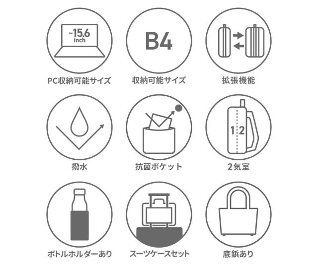 | 仕様 | <外側> ジップポケット(L)×2 ジップポケット(M)×2 <前面収納> スナップポケット(L)×1 ジップポケット(M)×1 メッシュポケット(S)×2 ボトルホルダー×1 ペンホルダー×2 <背面収納> PC収納×1 <付属品> チェストストラップ×1 |
