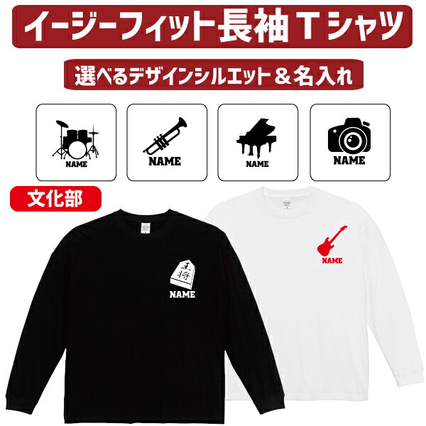 長袖 ロンT 名入れイージーフィットロングスリーブTシャツ「文化部」Tシャツ 管楽器 軽音楽部 ドラム ギター ベース サックス トランペット フルート チューバ ホルン 読書 書道 茶道 園芸 映画 天文学 パソコン 新聞 歴史 美術 科学 写真部 カメラ