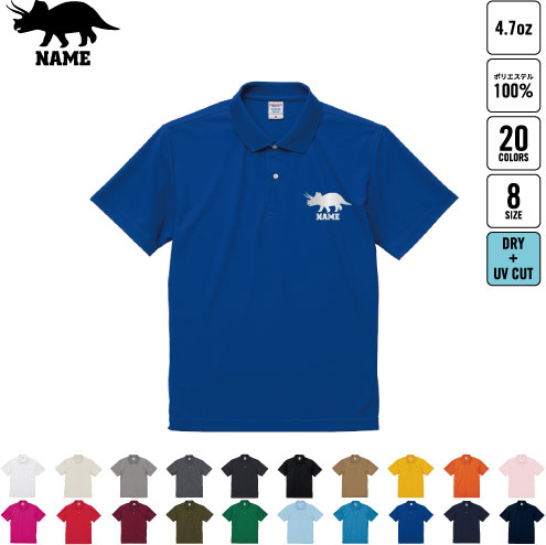 トリケラトプス3 名入れドライポロシャツ 半袖ポロシャツ おしゃれポロ お名前入り フィットネス ジムウェア プラクティスシャツ 運動着 スポーツウェア ジョギング 恐竜 化石 肉食 草食 雑食 海 陸 チームウェア クラスシャツ 記念シャツ お揃いウェア