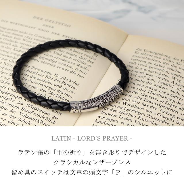 ラテン語の「主の祈り」を浮き彫りでデザインしたクラシカルなレザーブレス