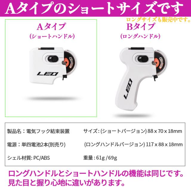 使い方は、ぜひ動画をご覧ください♪■適合ハリサイズ(目安):丸セイゴ5~14号/伊勢尼1~15号/グレ3~7号/チヌ1~9号/マダイ7~13号/カワハギ(スピード)7~8号/カレイ8~16号/狐0.8~10号/袖2~12号/ヘラスレ2~10号■持ち運びしやすく、ケース付きの乾電池式の薄型釣り針結び器です。■初心者でも安心!自動だから、釣り針結びが楽々!■ピストル型だから、握りやすい!