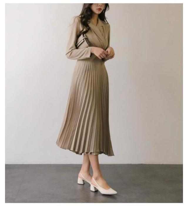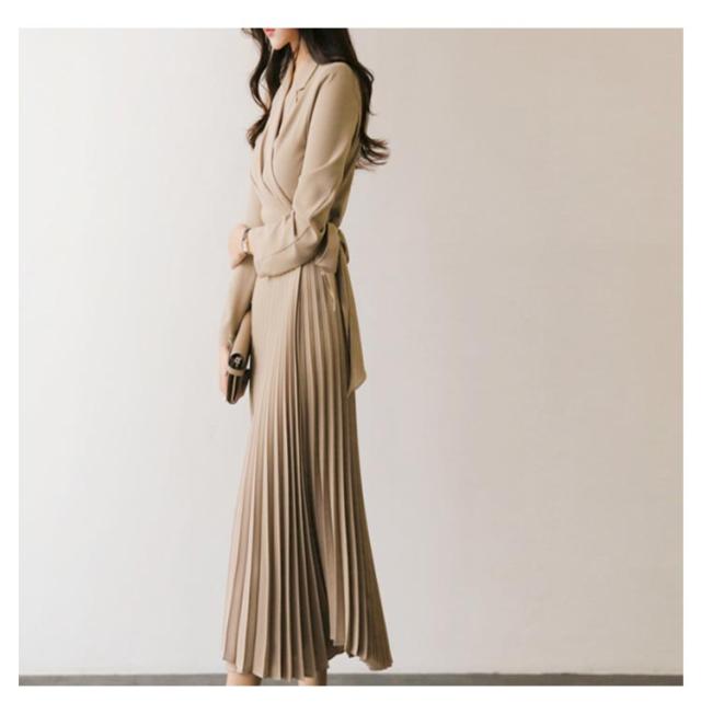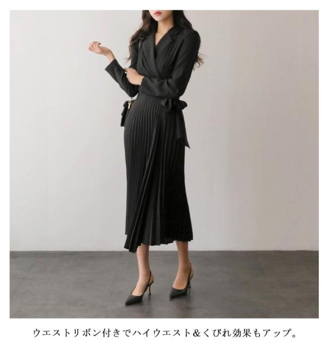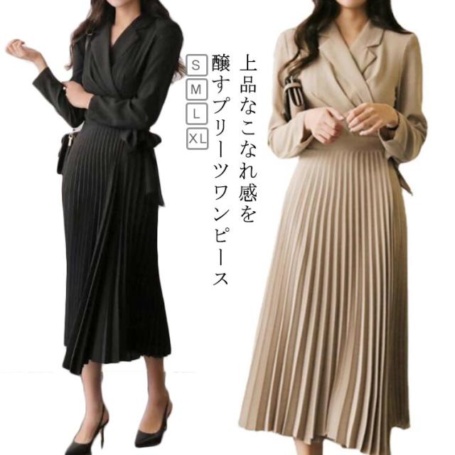 全3色【S-XL】 ワンピース プリーツ スーツ ドレス レディース 春 夏 秋 秋冬 長袖 リボン プリーツワンピース ロング丈 Vネック ミモレ丈 ハイウエスト ワンピーススーツ ロングワンピース 裏地付き きれいめ 送料無料