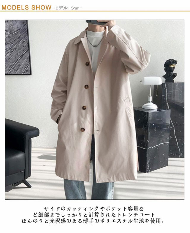 | M-5XL!サイドのカッティングやポケット容量など細部までしっかりと計算されたトレンチコート ほんのりと光沢感のある薄手のポリエステル生地を使用。軽くサラリとした質感なので、袖に腕を通す時も摩擦が少なく、スムーズに着脱できます スーツの上からでもゆとりがありバランスの良いスタイリッシュなハーフ丈。 キレイめなスタイルにはもちろん、軽やかな生地なのでカジュアルなスタイルにも合います。春先にライトアウターとして重宝するアイテムです | |