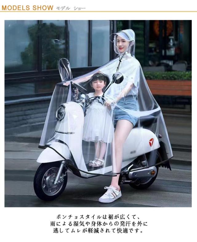| 全身がすっぽり入る大型ロングサイズのレインコート PVC防水加工で雨水の滲みにくい耐水性を実現しています。 フードには大きめで硬めの透明ツバ付き。雨風から顔の濡れを防ぎ、視界を確保する ポンチョスタイルは裾が広くて、雨による湿気や身体からの発汗を外に逃してムレが軽減されて快適です。 サイクリングやオートバイや自転車による通勤・通学・送迎に。野球やサッカーなどのスポーツ観戦やフェスなどの野外イベントにも、はたまた釣りやキャンプなどアウトドアにも◎ | |