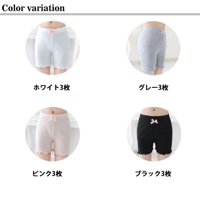 | 【3枚組】【100〜150cm】【全4色】 伸縮性に優れてとても動きやすい素材です。 かさばらない薄手の生地でズボンにも、スカートの下にもばっちりの着心地です。 小学校など体育の授業でハーフパンツの隙間から下着が見えないように大活躍です! 前後が分かりやすいようにリボンが付いているのも嬉しい! フリル裾のデザインで、ガーリー度たっぷり! 窮屈さやムレはなく、とっても快適な履き心地〜 柔らかくて通気性があり、締め付け感もなく、着心地抜群! | |