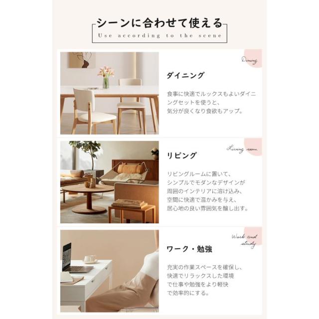 【快適なデスク下スペース】 テーブルの高さは75.5cmで、足元にゆとりを持たせている。椅子の高さは42cmで、適度な高低差が快適な食事体験を提供する。
